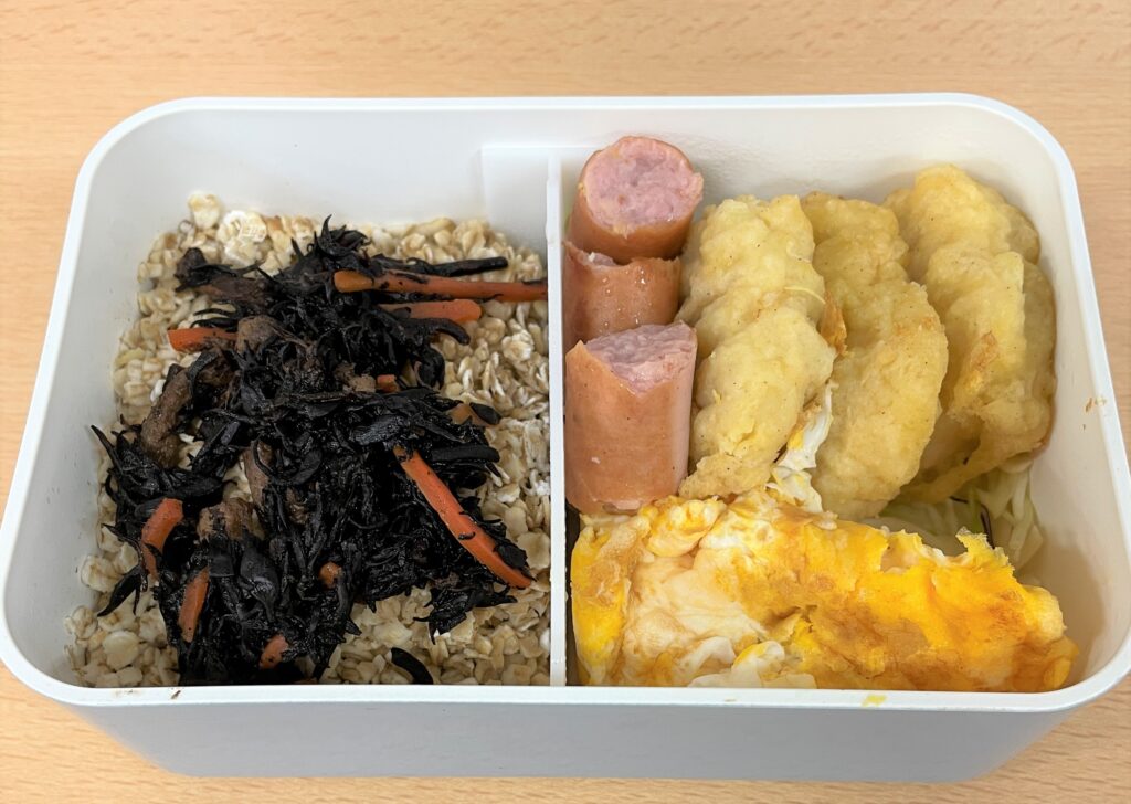 お弁当(オートミール40g、ひじき煮大さじ1、玉子焼き、業スーナゲット3つ、ウインナー1本、千切りキャベツ少し