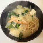 シマダヤの糖質オフうどん。具は白菜、小松菜、もやし、豆腐50g、スモークチキン50g。