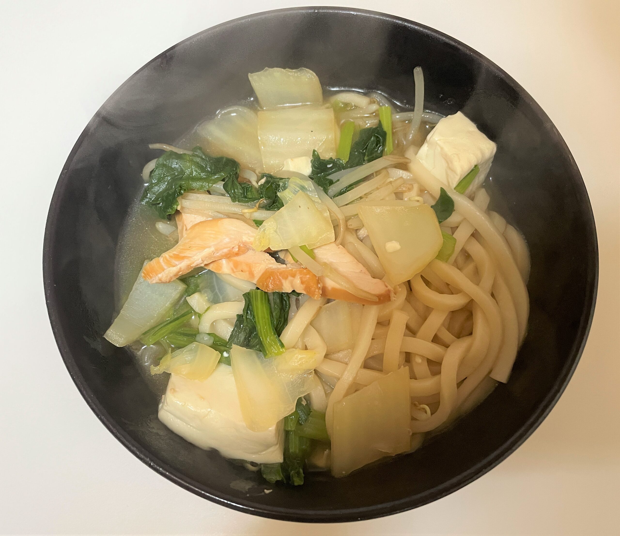 シマダヤの糖質オフうどん。具は白菜、小松菜、もやし、豆腐50g、スモークチキン50g。