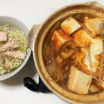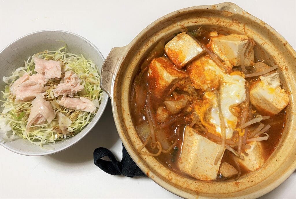 スンドゥブチゲ(白菜・もやし・豆腐・卵・糖質オフ麺半玉・鶏むね)