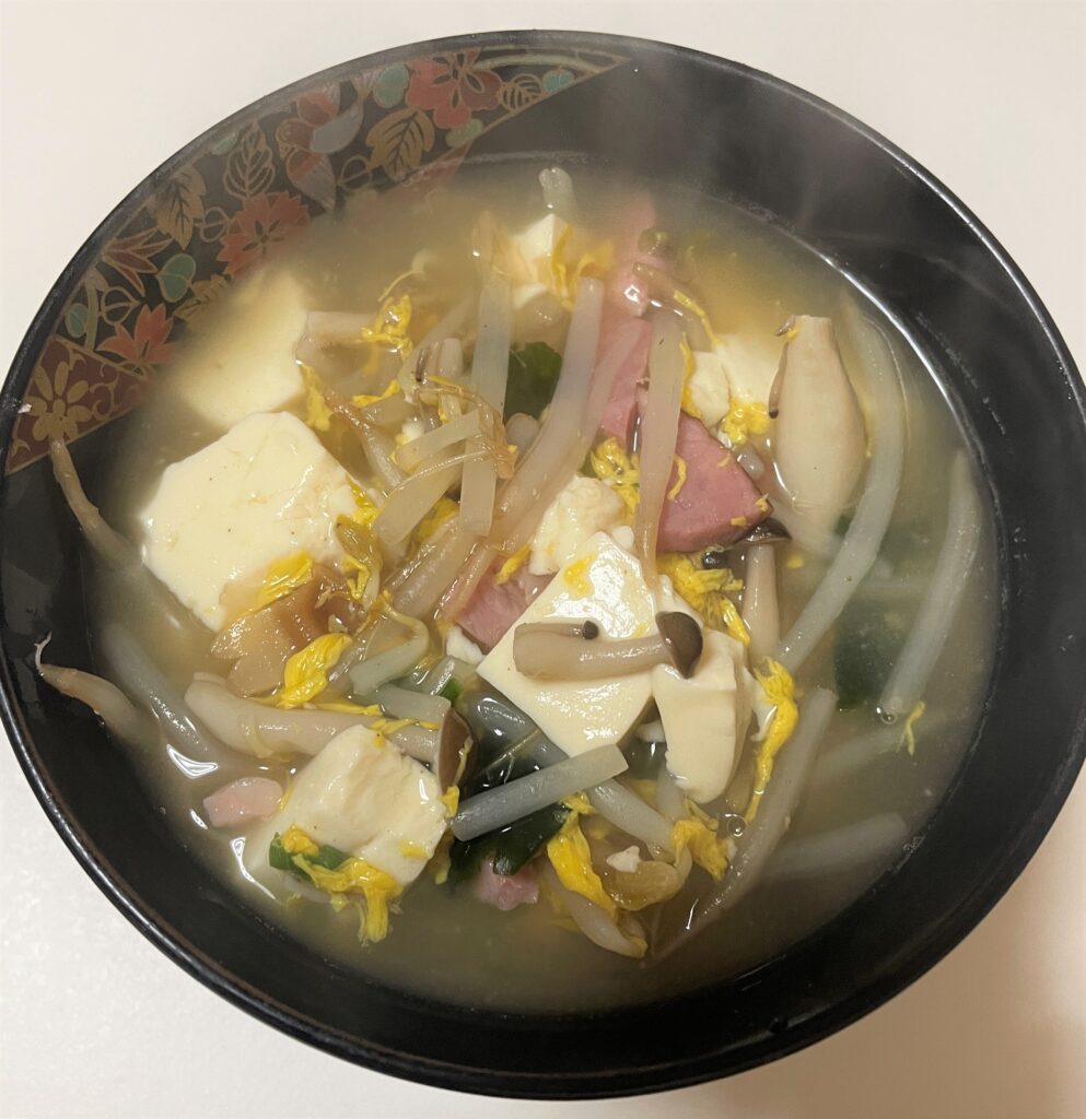 フリーズドライの卵わかめスープに、豆腐と野菜とオートミールを入れるだけで超簡単です♪