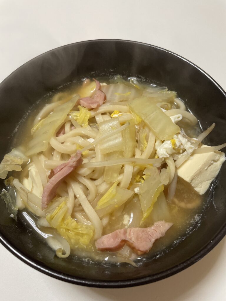 いつものように白菜もやしや豆腐をゴチャッと入れた簡単ぶっこみうどんですが、これがまた美味しい!今回は豪華に卵も入れてます♪