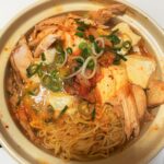 市販のスンドゥブチゲの素、糖質ゼロ麺 120g、スモークチキン 50g、絹ごし豆腐 150g、卵 1個、白菜、もやし、しめじ、ねぎ(少量)、キムチ