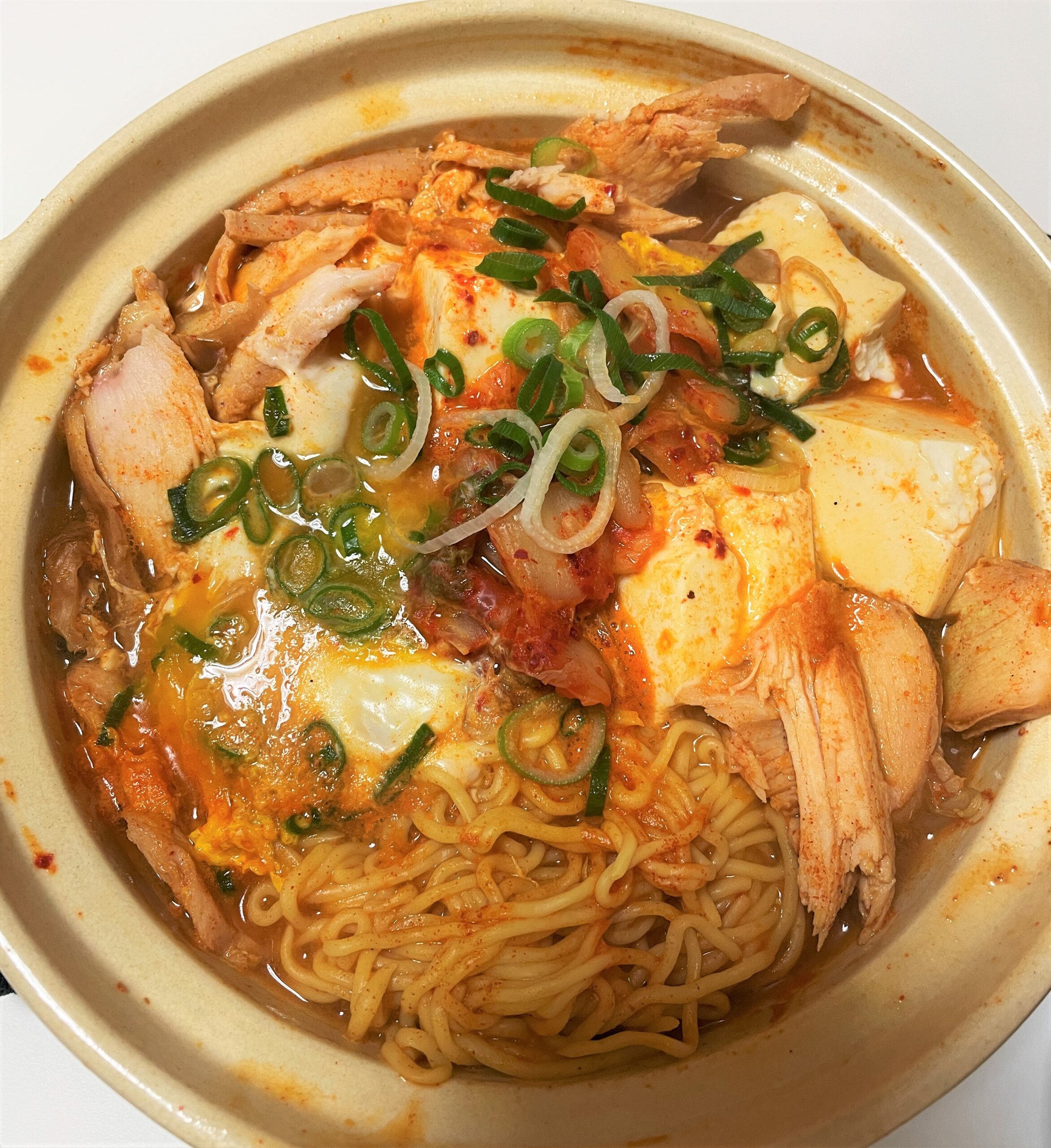 市販のスンドゥブチゲの素、糖質ゼロ麺 120g、スモークチキン 50g、絹ごし豆腐 150g、卵 1個、白菜、もやし、しめじ、ねぎ(少量)、キムチ