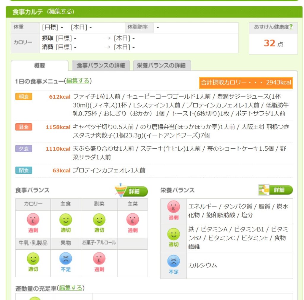 下の画像は、私がチートデイを実施したとき(59.4kg・体脂肪率31.3%)のあすけん記録です👇